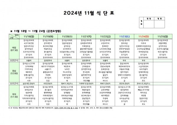 11월 셋째주 식단표 페이지 정보 작성자 은천노인복지회 작성일24-11-15 09:26 조회13,411회 댓글0건 관련링크 이전글 다음글 목록 답변 본문 . 이전글 다음글 목록 답변