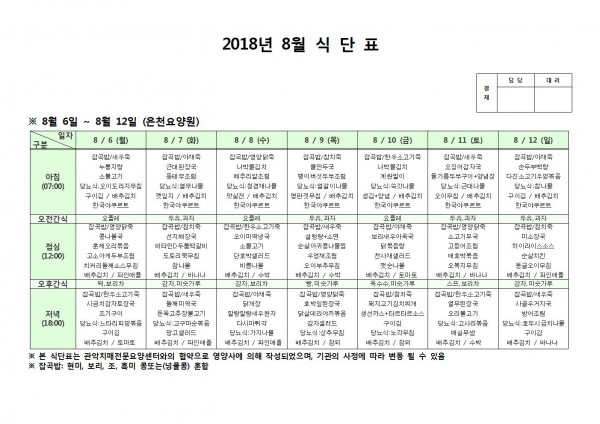 8월 둘째주 식단표 페이지 정보 작성자 은천노인복지회 작성일18-08-13 11:35 조회199,493회 댓글0건 관련링크 이전글 다음글 목록 답변 본문 8월 둘째주 식단표 이전글 다음글 목록 답변