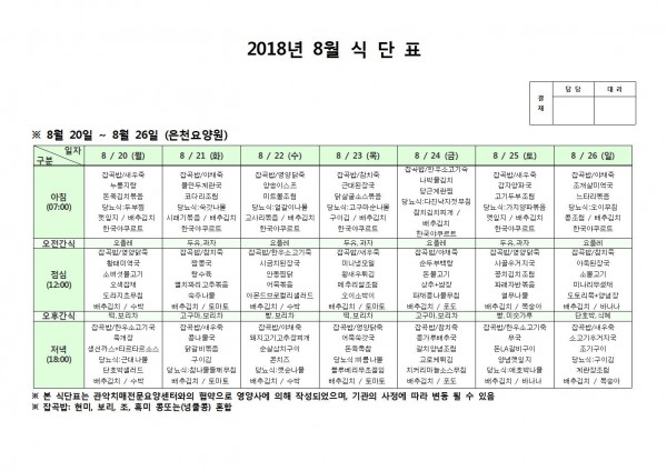 8월 넷째주 식단표 페이지 정보 작성자 은천노인복지회 작성일18-08-27 14:01 조회199,568회 댓글0건 관련링크 이전글 다음글 목록 답변 본문 8월 넷째주 식단표다 이전글 다음글 목록 답변