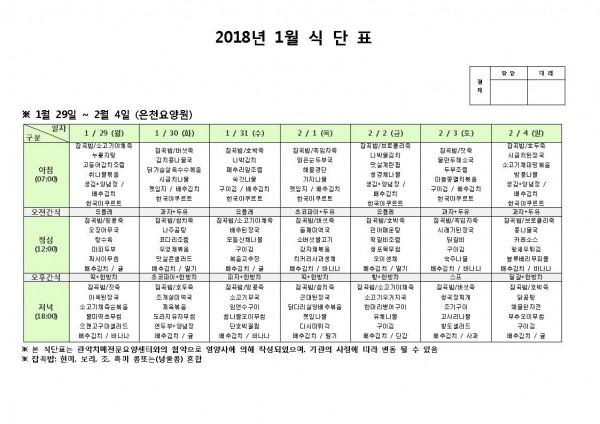 1월 다섯째주 식단표 페이지 정보 작성자 은천노인복지회 작성일18-01-31 13:35 조회187,255회 댓글0건 관련링크 이전글 다음글 목록 답변 본문 1월 다섯째주 식단표 이전글 다음글 목록 답변
