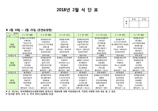2월 셋째주 식단표 페이지 정보 작성자 은천노인복지회 작성일18-02-19 10:50 조회188,549회 댓글0건 관련링크 이전글 다음글 목록 답변 본문 2월 셋째주 식단표 이전글 다음글 목록 답변