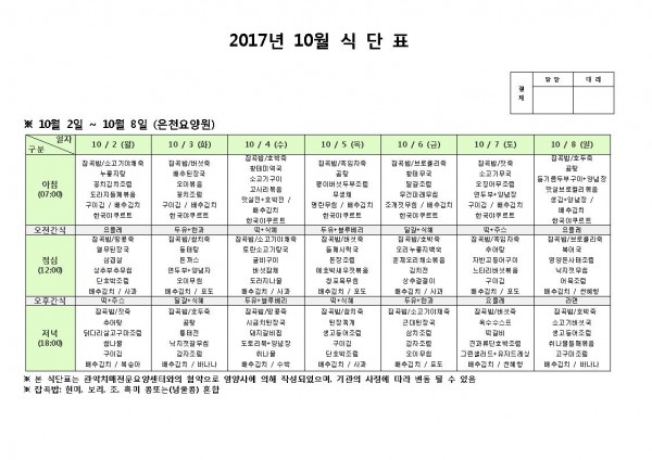10월 첫째주 식단표 페이지 정보 작성자 은천노인복지회 작성일17-10-11 10:52 조회176,507회 댓글0건 관련링크 이전글 다음글 목록 답변 본문 10월 첫째주 식단표 이전글 다음글 목록 답변