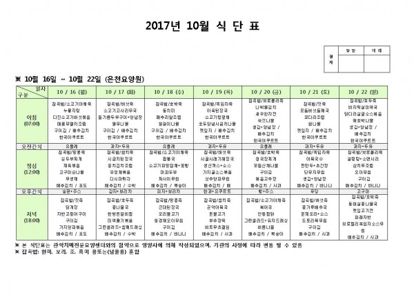 10월 셋째주 식단표 페이지 정보 작성자 은천노인복지회 작성일17-10-17 17:39 조회177,476회 댓글0건 관련링크 이전글 다음글 목록 답변 본문 10월 셋째주 식단표 이전글 다음글 목록 답변