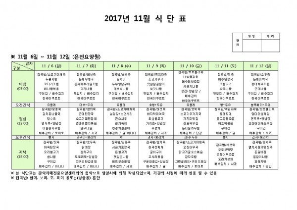 11월 둘째주 식단표 페이지 정보 작성자 은천노인복지회 작성일17-11-09 10:44 조회178,592회 댓글0건 관련링크 이전글 다음글 목록 답변 본문 11월 둘째주 식단표 이전글 다음글 목록 답변