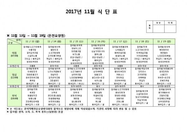 11월 셋째주 식단표 페이지 정보 작성자 은천노인복지회 작성일17-11-13 17:29 조회178,782회 댓글0건 관련링크 이전글 다음글 목록 답변 본문 11월 셋째주 식단표 이전글 다음글 목록 답변