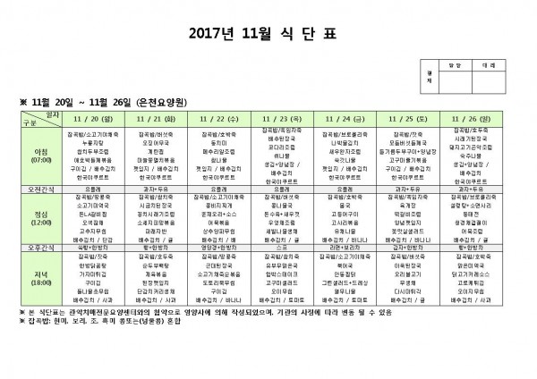 11월 넷째주 식단표 페이지 정보 작성자 은천노인복지회 작성일17-11-20 11:22 조회180,257회 댓글0건 관련링크 이전글 다음글 목록 답변 본문 11월 넷째주 식단표 이전글 다음글 목록 답변