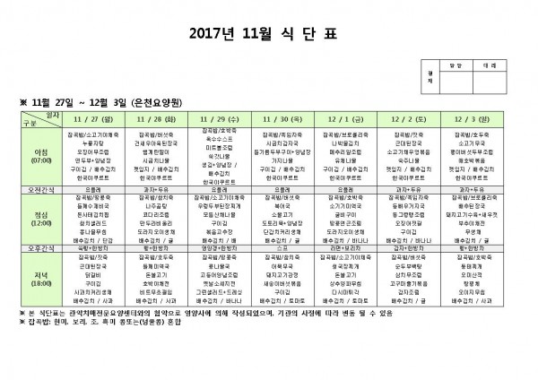 12월 첫째주 식단표 페이지 정보 작성자 은천노인복지회 작성일17-11-27 14:34 조회180,694회 댓글0건 관련링크 이전글 다음글 목록 답변 본문 12월 첫째주 식단표 이전글 다음글 목록 답변