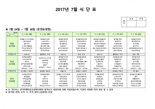 7월 넷째주 식단표 페이지 정보 작성자 은천노인복지회 작성일17-07-24 17:56 조회173,716회 댓글0건 관련링크 이전글 다음글 목록 답변 본문 7월 넷째주 식단표 이전글 다음글 목록 답변