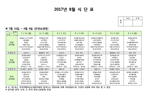 8월 첫째주 식단표 페이지 정보 작성자 은천노인복지회 작성일17-08-01 13:43 조회174,438회 댓글0건 관련링크 이전글 다음글 목록 답변 본문 8월 첫째주 식단표 이전글 다음글 목록 답변