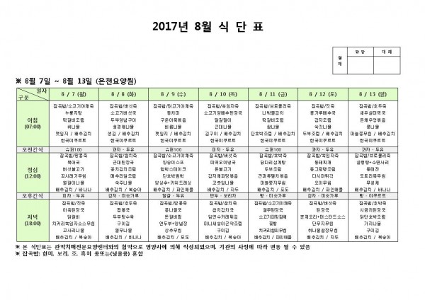 8월 둘째주 식단표 페이지 정보 작성자 은천노인복지회 작성일17-08-07 09:46 조회174,488회 댓글0건 관련링크 이전글 다음글 목록 답변 본문 8월 둘째주 식단표 이전글 다음글 목록 답변