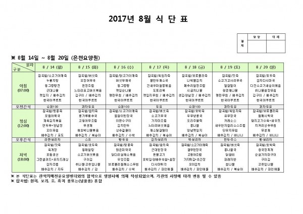 8월 셋째주 식단표 페이지 정보 작성자 은천노인복지회 작성일17-08-14 14:05 조회173,835회 댓글0건 관련링크 이전글 다음글 목록 답변 본문 8월 셋째주 식단표 이전글 다음글 목록 답변