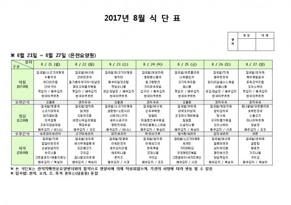 8월 넷째주 식단표 페이지 정보 작성자 은천노인복지회 작성일17-08-21 10:51 조회173,991회 댓글0건 관련링크 이전글 다음글 목록 답변 본문 8월 넷째주 식단표 이전글 다음글 목록 답변