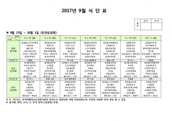 9월 넷째주 식단표 페이지 정보 작성자 은천노인복지회 작성일17-10-11 10:51 조회175,736회 댓글0건 관련링크 이전글 다음글 목록 답변 본문 9월 넷째주 식단표 이전글 다음글 목록 답변