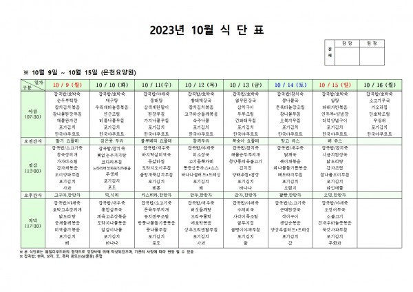 10월 둘째주 식단표 페이지 정보 작성자 은천노인복지회 작성일23-10-05 17:41 조회31,257회 댓글0건 관련링크 이전글 다음글 목록 답변 본문 . 이전글 다음글 목록 답변