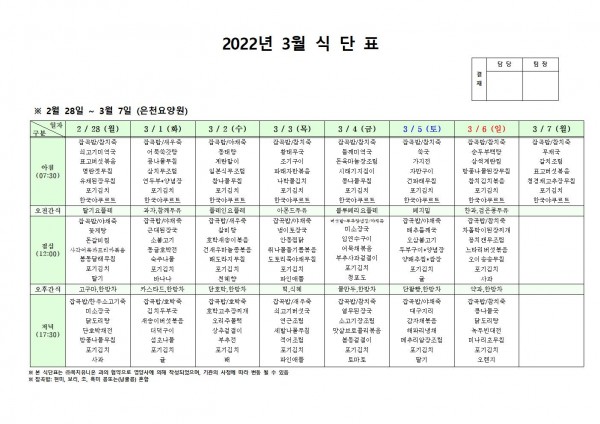 3월 첫째주 식단표 페이지 정보 작성자 은천노인복지회 작성일22-02-25 09:22 조회108,168회 댓글0건 관련링크 이전글 다음글 목록 답변 본문 . 이전글 다음글 목록 답변