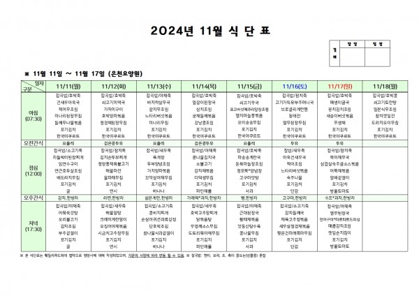 11월 둘째주 식단표 페이지 정보 작성자 은천노인복지회 작성일24-11-07 16:50 조회13,611회 댓글0건 관련링크 이전글 다음글 목록 답변 본문 . 이전글 다음글 목록 답변