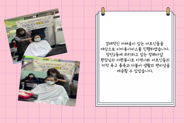 [재가노인지원서비스] 이미용 서비스 페이지 정보 작성자 은천노인복지회 작성일22-03-30 14:02 조회16,996회 댓글0건 관련링크 이전글 다음글 목록 답변 본문 3월 이미용 서비스 이전글 다음글 목록 답변