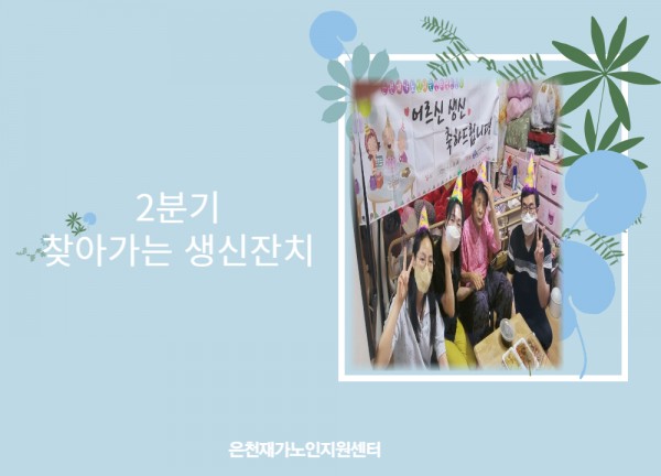 [재가노인지원서비스] 2분기 찾아가는 생신잔치 페이지 정보 작성자 은천노인복지회 작성일22-07-06 13:26 조회16,397회 댓글0건 관련링크 이전글 다음글 목록 답변 본문 2분기 찾아가는 생신잔치 이전글 다음글 목록 답변