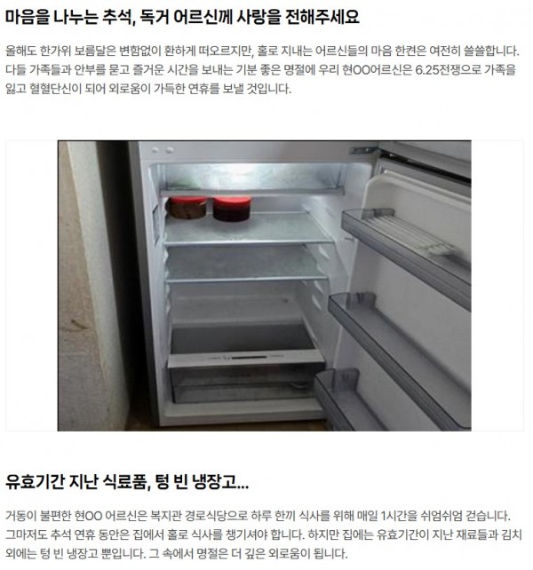 어르신들에게 추석 선물을 지원하고자 해피빈 모금 사업을 진행하고 있습니다.