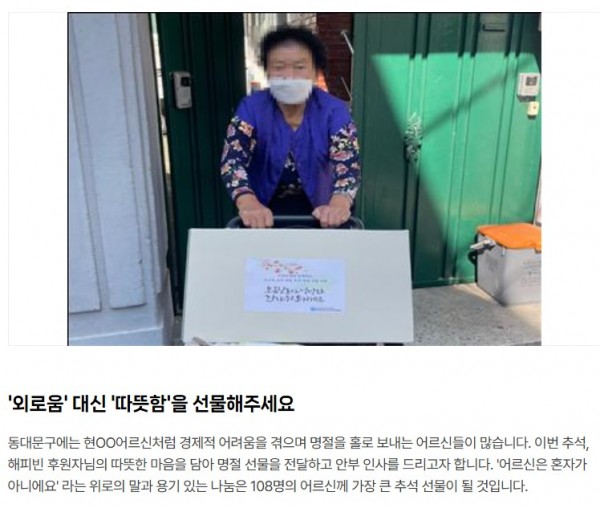 [서울시동대문구재가노인복지기관] 명절(추석) 선물 지원 관련 해피빈 모금 사업 진행